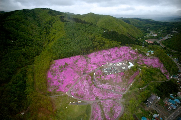 芝桜遊覧飛行のヘリに乗ってみました。天気はいまいちだったけど上からの眺めはミニチュア的でいいねぇ。