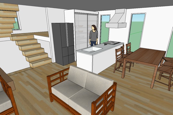 居間から見たキッチンダイニング周辺。