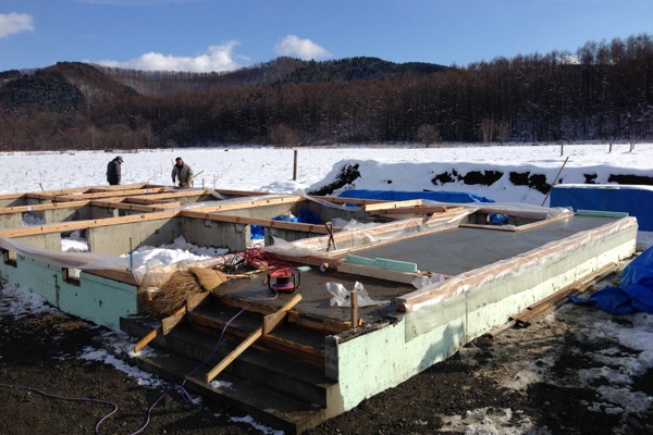 玄関付近とストーブ付近のコンクリート注入完了し、階段ができてました。