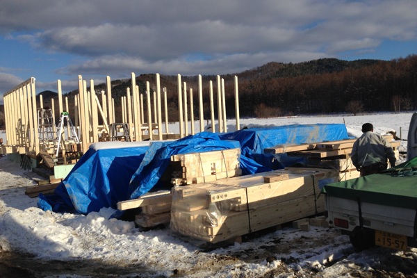 手前にはプレカットの材料が並んでいます。全部加工済みだから組み立て早いんだろうなぁ。