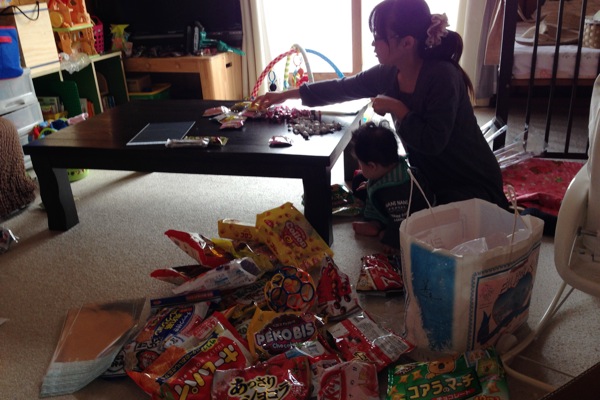 上棟式に行う餅まきで一緒に撒くお菓子の袋詰め作業です。もちはさすがにお店に頼みました。